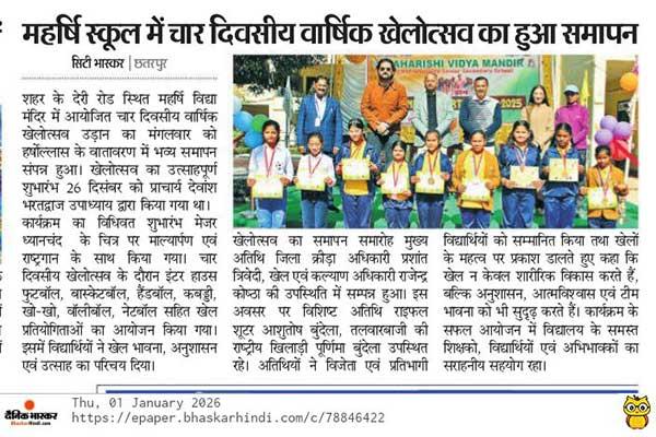 A District-Level Badminton Tournament was successfully organized at Maharishi Vidya Mandir, Deri Road, Chhatarpur.